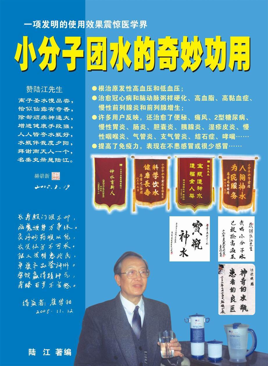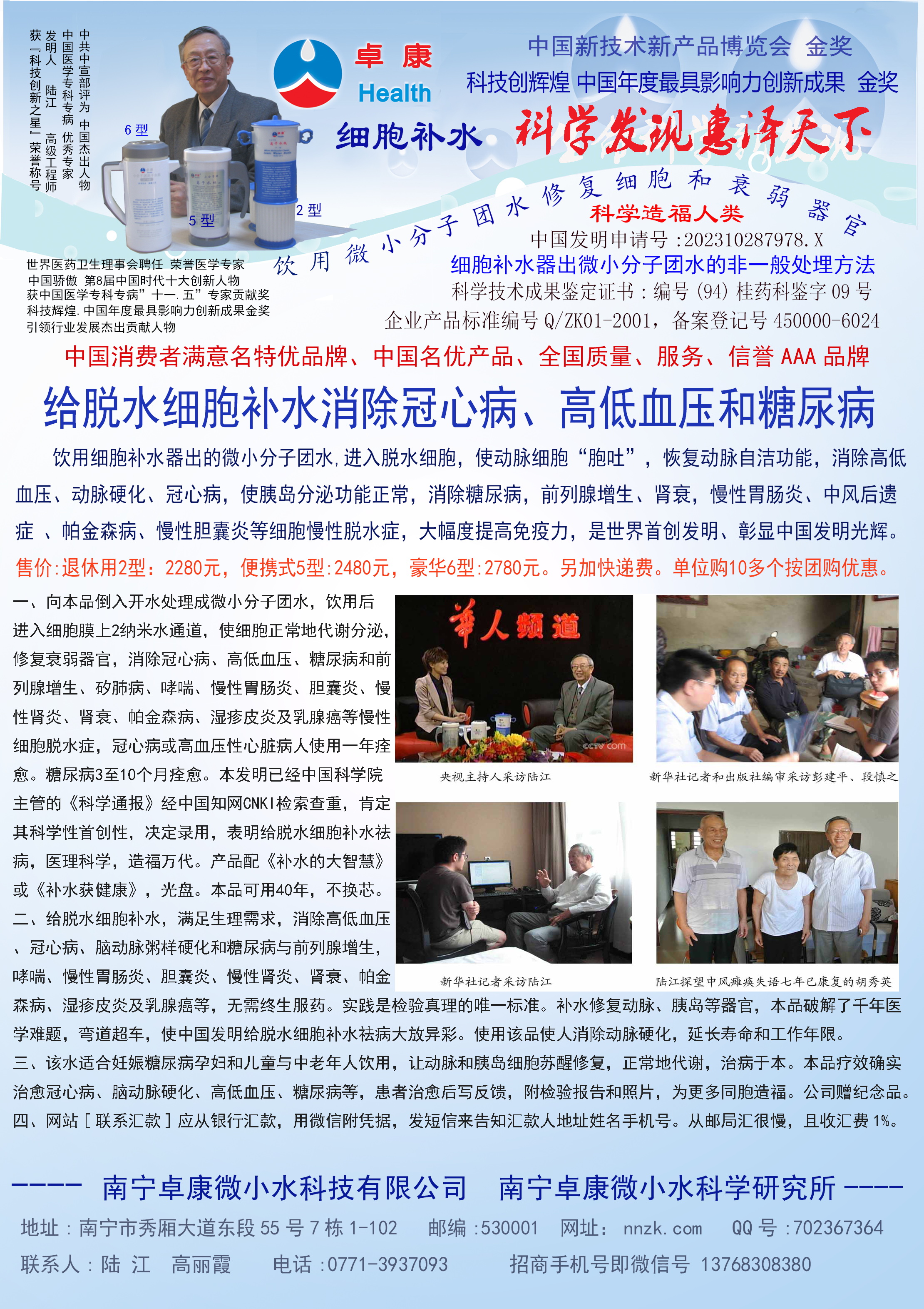 人類幾千年來患以上病癥需終生服藥,幾十年也不能治愈。可是我國南寧的高級工程師陸 江,于1990年想根治高血壓,研究發(fā)明了離子水瓶,處理出微小分子團(tuán)水供飲用,經(jīng)過醫(yī)院臨床試用和專家鑒定,1999年獲中國發(fā)明專利權(quán),產(chǎn)品于2000年投放市場后一直跟蹤調(diào)查,據(jù)全國各地用戶反饋:祛除了高低血壓、糖尿病和冠心病,并使前列腺增生、咽喉炎、鼻竇炎、慢性氣管炎、支氣管炎、矽肺病、哮喘、慢性胃炎、腸炎、慢性膽囊炎、慢性腎炎、腎衰、膀胱炎、便秘、痔瘡、風(fēng)濕性關(guān)節(jié)炎和濕疹皮炎及中風(fēng)后遺癥等病癥不藥而愈。為什么喝微小水能治20多種病?陸 江從1991年德國科學(xué)家發(fā)現(xiàn)細(xì)胞膜水通道僅為2納米獲得啟發(fā),認(rèn)為多種器官患病是因細(xì)胞脫水,不能正常代謝和分裂增殖,才使器官細(xì)胞減少致衰弱萎縮而形成細(xì)胞缺水性病癥。22年來的實踐有力地支持了“細(xì)胞脫水致病”這一重要論點,表明喝微小水可滿足細(xì)胞的生理需求,補(bǔ)水就能祛病,是生命科學(xué)新亮點。